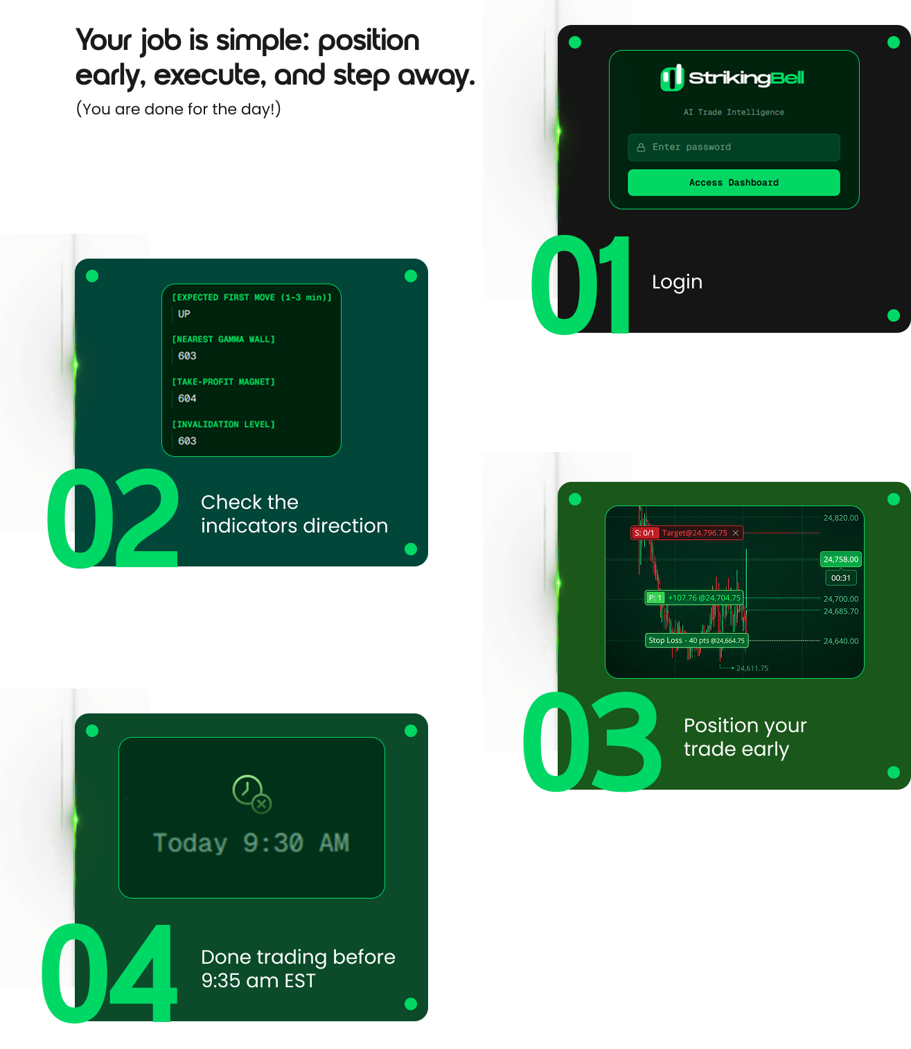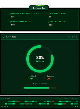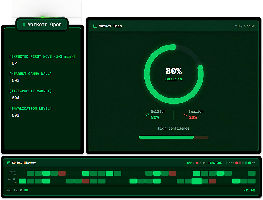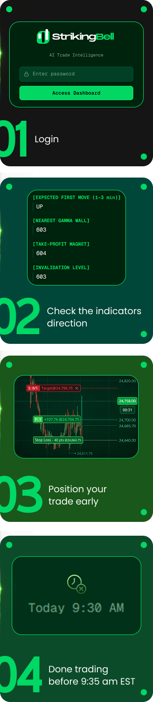 Striking Bell analyzes dealer hedging and thousands of institutional positioning before the open, so you know the most probable first move before 9:30 AM EST. No hard indicators. No chart clutter. No complexity.